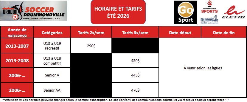 Horaire saison été U13+ (2013-...)