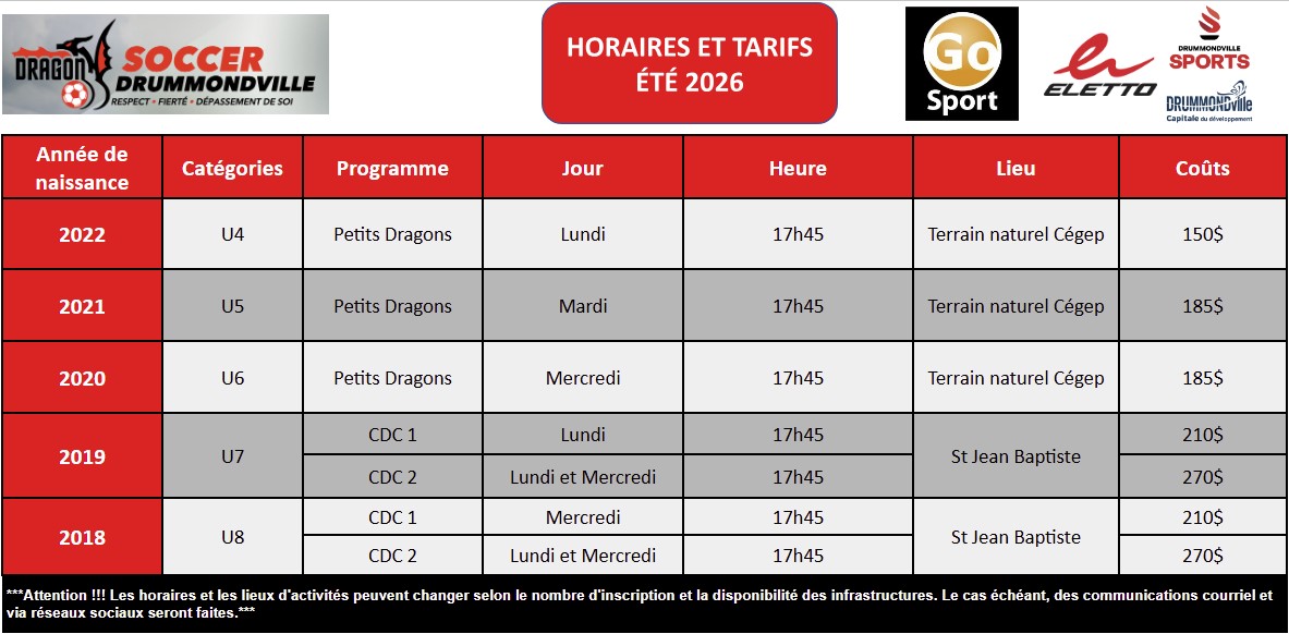 Chaque joueur des Petits Dragons recevra un chandail aux couleurs du club (soit lors du festival d’ouverture, soit sur rendez-vous).