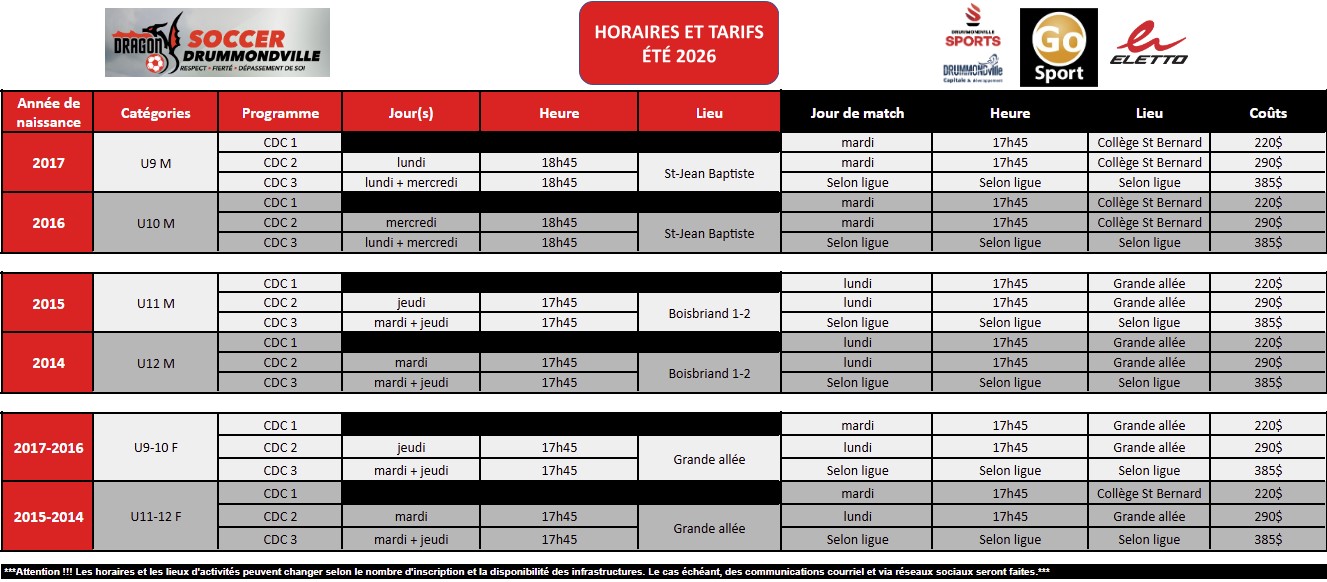 CDC 2 : Ce programme est destiné aux jeunes qui souhaitent progresser et venir jouer au soccer pour s’amuser et profiter de l’été. Il offre un match pour les U9-U10 et U11-U12 sous forme de «soccer de rue» (les équipes sont refaites chaque semaine en fonction des joueurs présents).