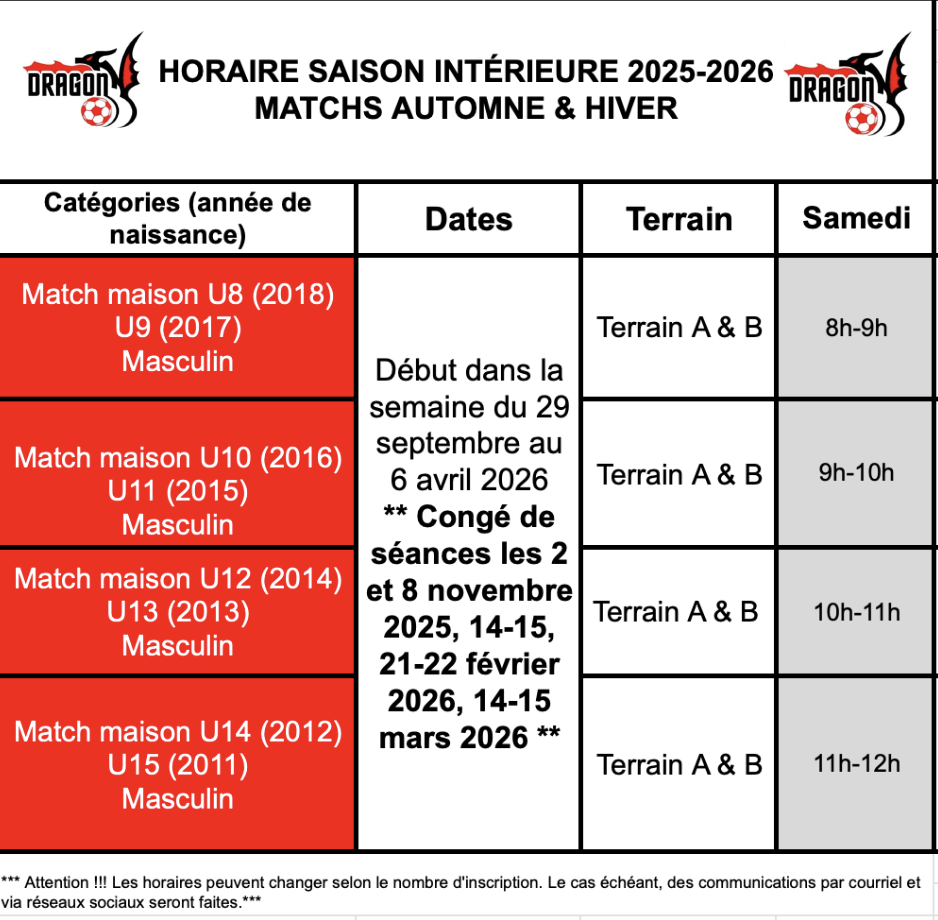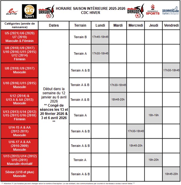 Pour toutes questions sur les horaires et les programmes, communiquez avec nous par courriel : cs.dragons@soccerdrummond.ca